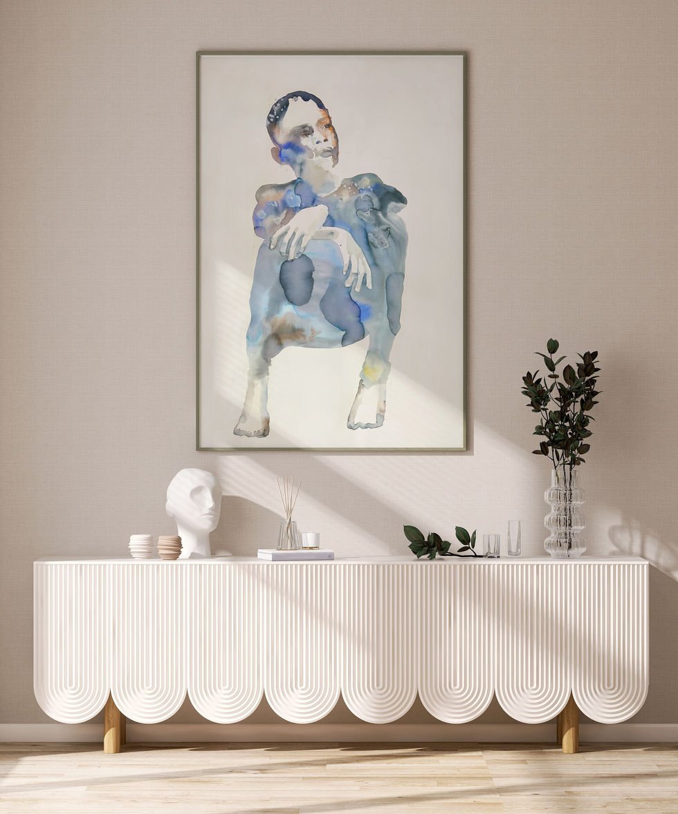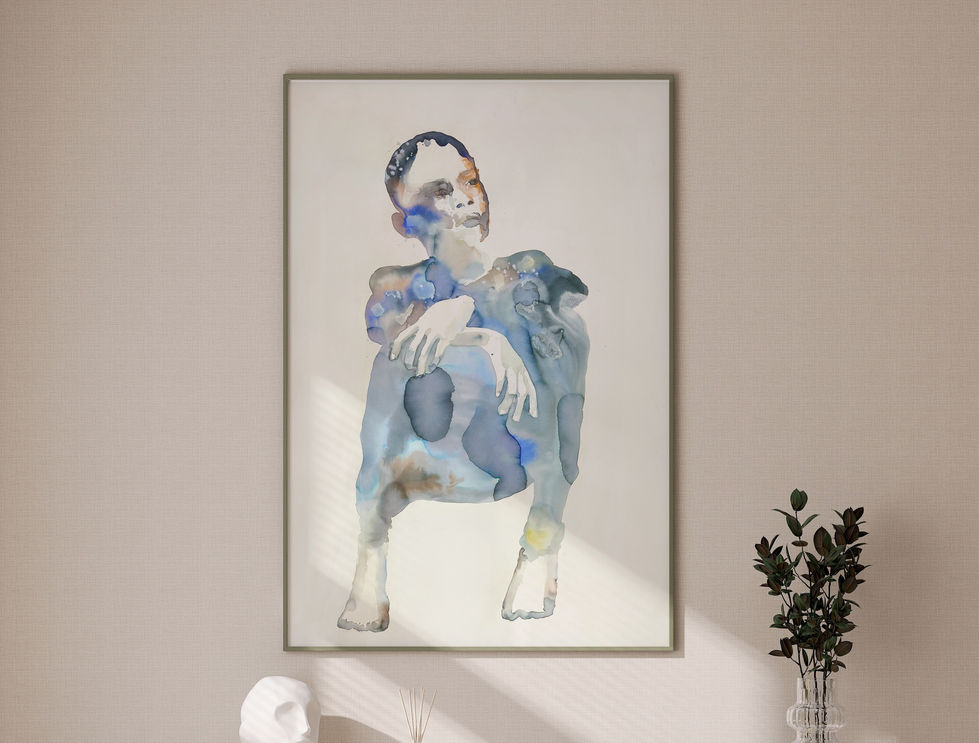 The image constructs a body in pause; the gesture of crossed hands, combined with the low posture, suggests a state of waiting, observation, and inward reflection. There is no evident tension or movement; the body seems suspended between action and contemplation. The gaze, directed toward the horizon rather than straight ahead, shifts the narrative to an internal time, closer to thought than to event. The choice of a white background intensifies the relationship between presence and absence, allowing the body to be defined both by matter and by void. The watercolor, with its transparencies and interruptions, reinforces the idea of a subject in formation, where identity does not fix but organizes itself in layers. The title Ethereum introduces a reading that tensions the organic and the immaterial. Just as the name evokes an invisible, volatile, and constantly changing field, the figure seems to exist between density and lightness, between body and thought, asserting subjectivity as an open, unstable space in perpetual construction.